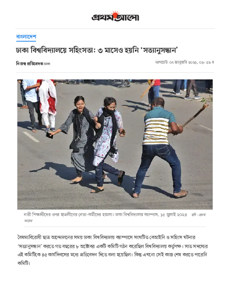 ঢাকা বিশ্ববিদ্যালয়ে সহিংসতা_ ৩ মাসেও হয়নি ‘সত্যানুসন্ধান’.pdf Published on 07 January 2025 Newspaper দৈনিক প্রথম আলো Category Campus Terrorism General Education Download