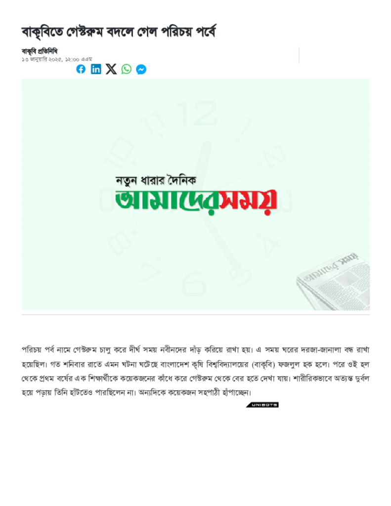 বাকৃবিতে গেস্টরুম বদলে গেল পরিচয় পর্বে.pdf Published on 13 January 2025 Newspaper দৈনিক আমাদের সময় Category General Education General Education Download