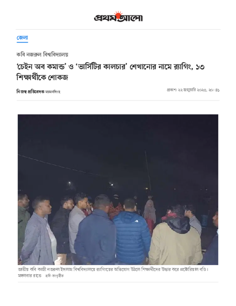 ‘চেইন অব কমান্ড’ ও ‘ভার্সিটির কালচার’ শেখানোর নামে র_্যাগিং, ১৩ শিক্ষার্থীকে শোকজ.pdf Published on 22 January 2025 Newspaper দৈনিক প্রথম আলো Category General Education General Education Download
