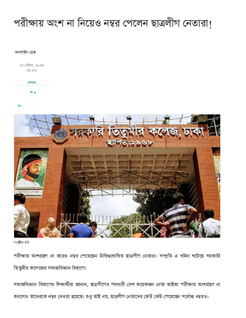 পরীক্ষায় অংশ না নিয়েও নম্বর পেলেন ছাত্রলীগ নেতারা!.pdf Published on 27 April 2025 Newspaper দৈনিক কালের কন্ঠ Category General Education General Education Download