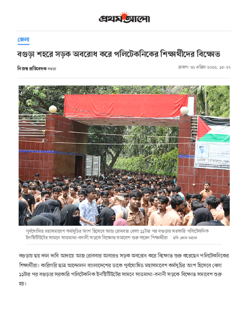 বগুড়া শহরে সড়ক অবরোধ করে পলিটেকনিকের শিক্ষার্থীদের বিক্ষোভ.pdf Published on 20 April 2025 Newspaper দৈনিক প্রথম আলো Category Technical and Vocational Education Download