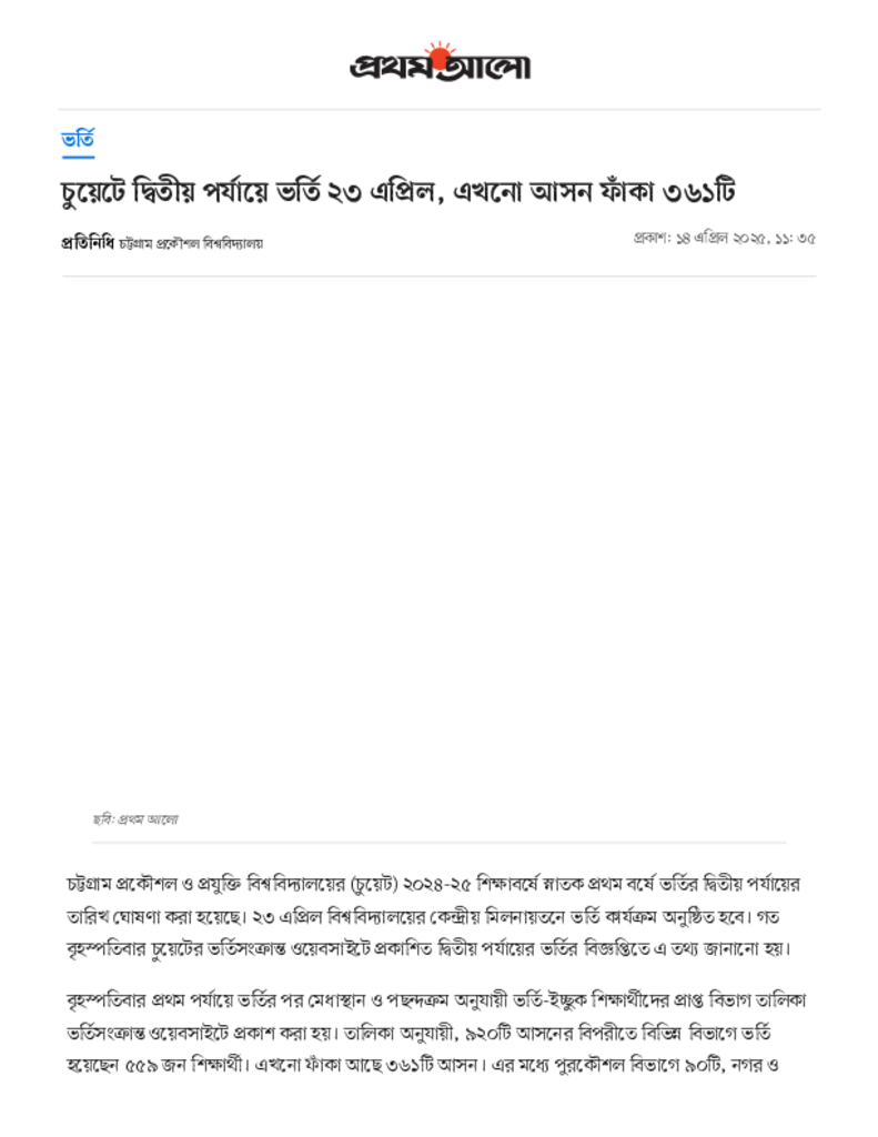 চুয়েটে দ্বিতীয় পর্যায়ে ভর্তি ২৩ এপ্রিল, এখনো আসন ফাঁকা ৩৬১টি _ প্রথম আলো.pdf Published on 14 April 2025 Newspaper দৈনিক প্রথম আলো Category Admission / Seat Problem General Education Professional Education Engineering Download