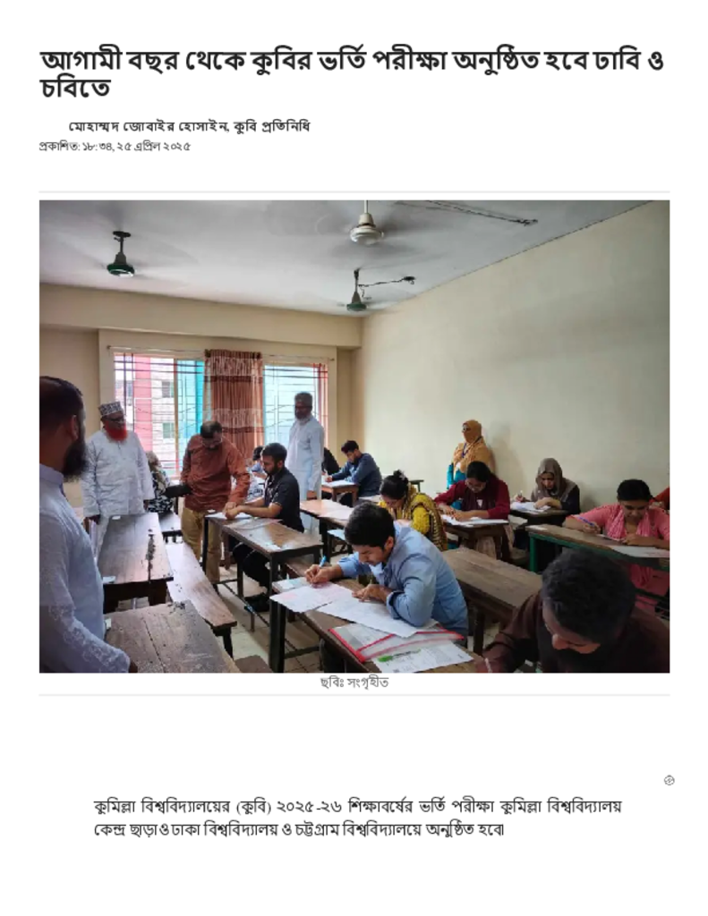 আগামী বছর থেকে কুবির ভর্তি পরীক্ষা অনুষ্ঠিত হবে ঢাবি ও চবিতে.pdf Published on 25 April 2025 Newspaper দৈনিক জনকণ্ঠ Category Admission / Seat Problem General Education Download