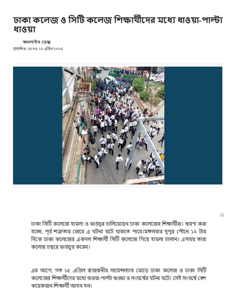 ঢাকা কলেজ ও সিটি কলেজ শিক্ষার্থীদের মধ্যে ধাওয়া-পাল্টা ধাওয়া.pdf Published on 22 April 2025 Newspaper দৈনিক জনকণ্ঠ Category Campus Terrorism General Education Download