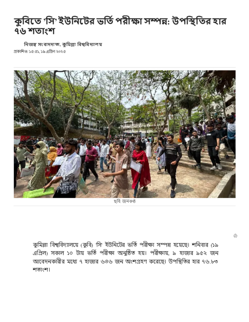 কুবিতে ’সি’ ইউনিটের ভর্তি পরীক্ষা সম্পন্ন_ উপস্থিতির হার ৭৬ শতাংশ.pdf Published on 19 April 2025 Newspaper দৈনিক জনকণ্ঠ Category Admission / Seat Problem General Education Download