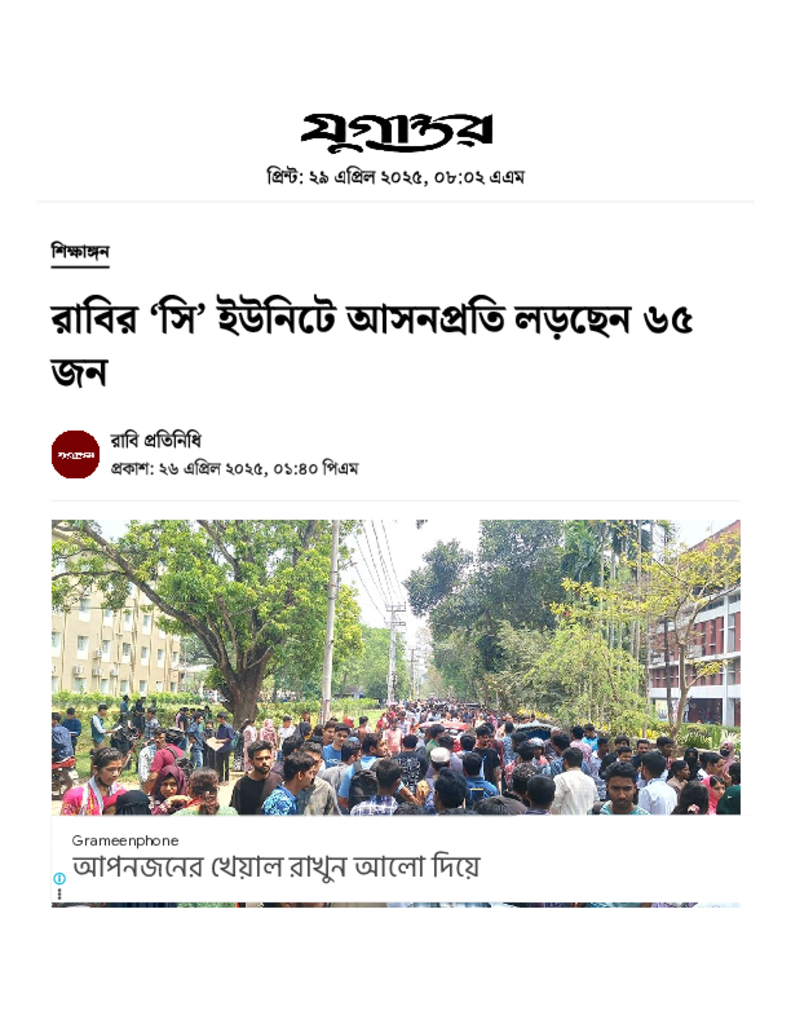রাবির ‘সি’ ইউনিটে আসনপ্রতি লড়ছেন ৬৫ জন.pdf Published on 26 April 2025 Newspaper দৈনিক যুগান্তর Category Admission / Seat Problem General Education Download