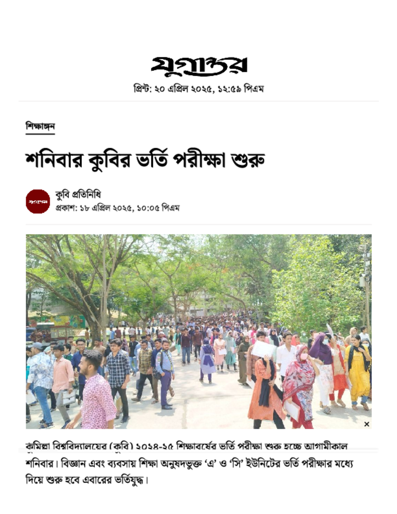 শনিবার কুবির ভর্তি পরীক্ষা শুরু.pdf Published on 18 April 2025 Newspaper দৈনিক যুগান্তর Category Admission / Seat Problem General Education Download