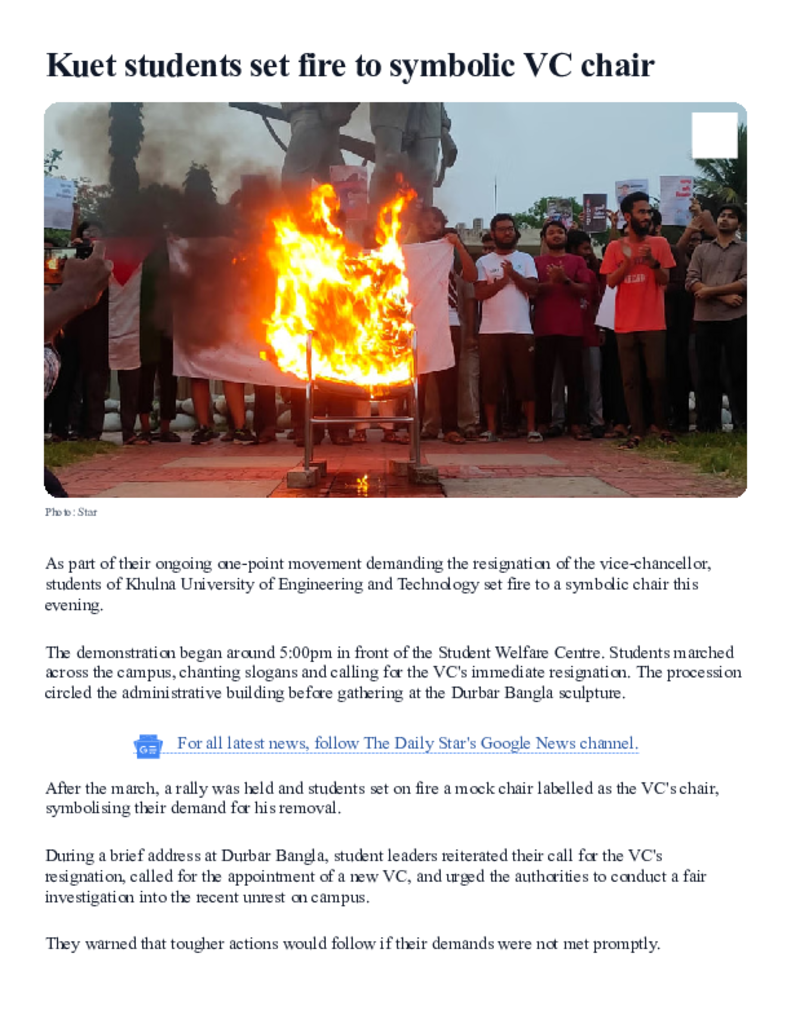 Kuet students set fire to symbolic VC chair _ The Daily Star.pdf Published on 17 April 2025 Newspaper The Daily Star Category Campus Terrorism General Education Download