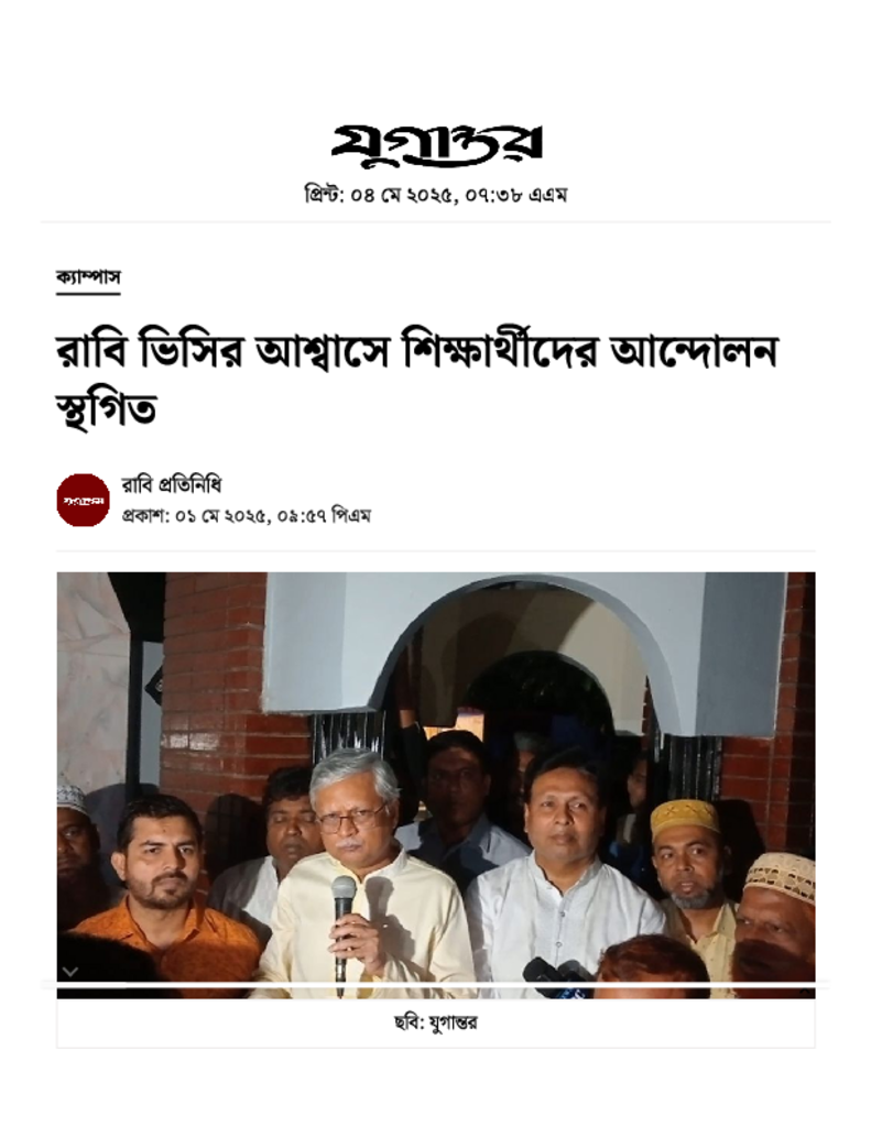 রাবি ভিসির আশ্বাসে শিক্ষার্থীদের আন্দোলন স্থগিত.pdf Published on 01 May 2025 Newspaper দৈনিক যুগান্তর Category Others General Education Download