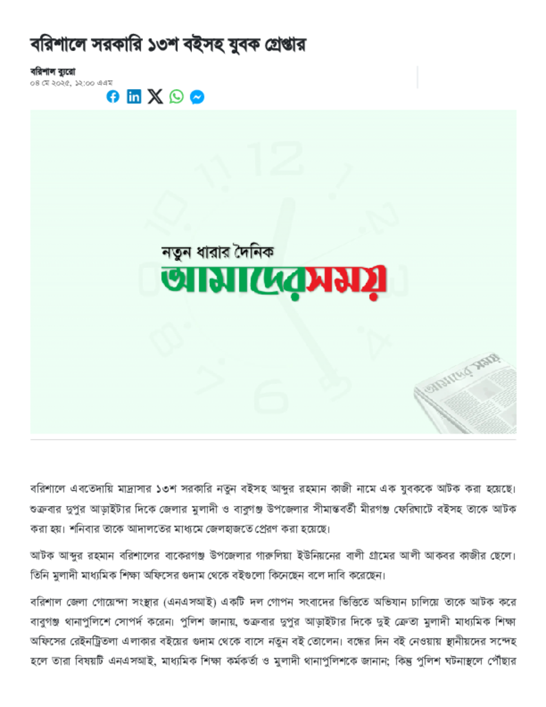 বরিশালে সরকারি ১৩শ বইসহ যুবক গ্রেপ্তার.pdf Published on 04 May 2025 Newspaper দৈনিক আমাদের সময় Category Others Download
