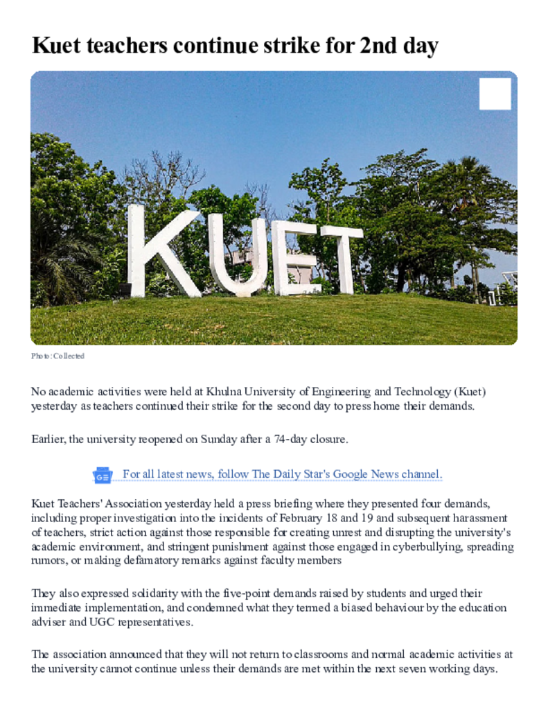 Kuet teachers continue strike for 2nd day _ The Daily Star.pdf Published on 06 May 2025 Newspaper The Daily Star Category Others General Education Download