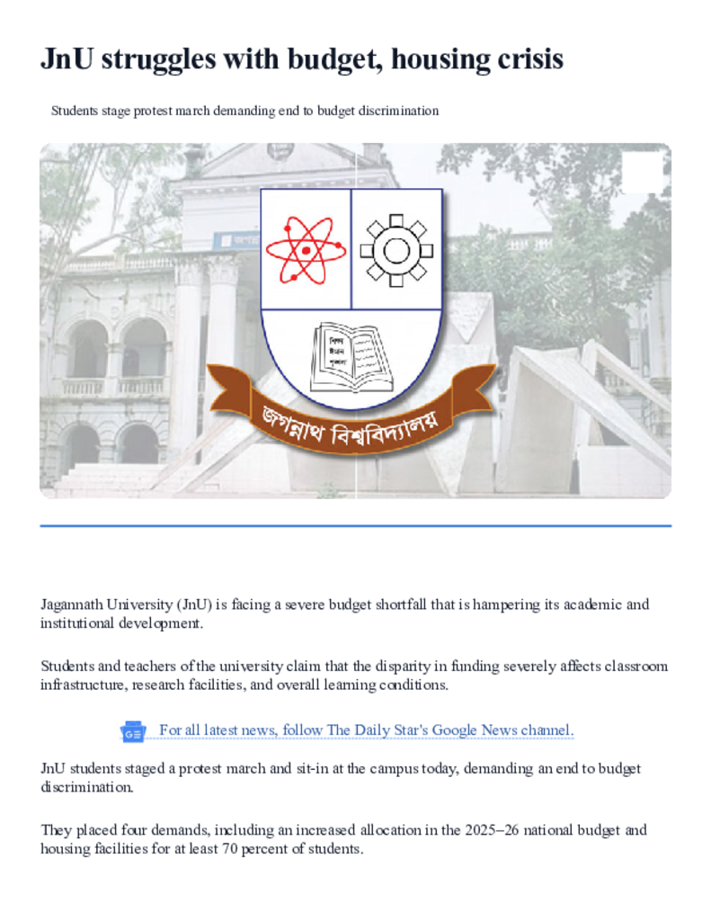 JnU struggles with budget, housing crisis _ The Daily Star.pdf Published on 06 May 2025 Newspaper The Daily Star Category Personal Opinion / Discussion / Commentary General Education Download