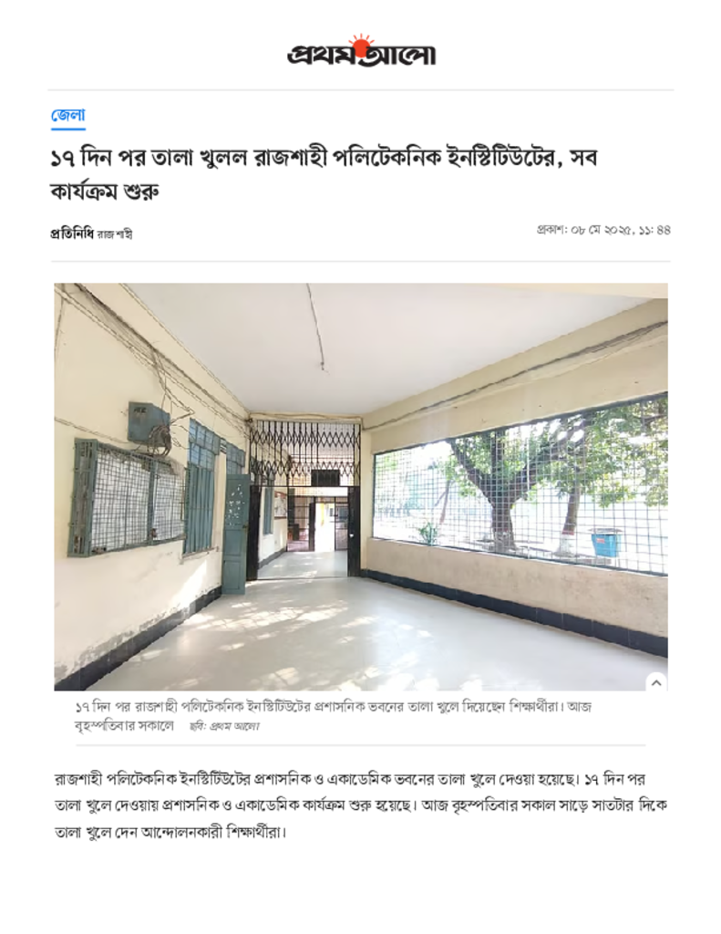 ১৭ দিন পর তালা খুলল রাজশাহী পলিটেকনিক ইনস্টিটিউটের, সব কার্যক্রম শুরু _ প্রথম আলো.pdf Published on 08 May 2025 Newspaper দৈনিক প্রথম আলো Category Technical and Vocational Education Download