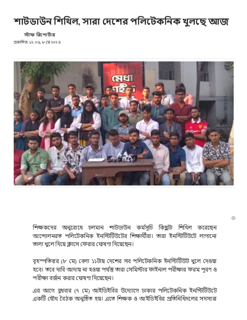 শাটডাউন শিথিল, সারা দেশের পলিটেকনিক খুলছে আজ.pdf Published on 08 May 2025 Newspaper দৈনিক জনকণ্ঠ Category Technical and Vocational Education Download