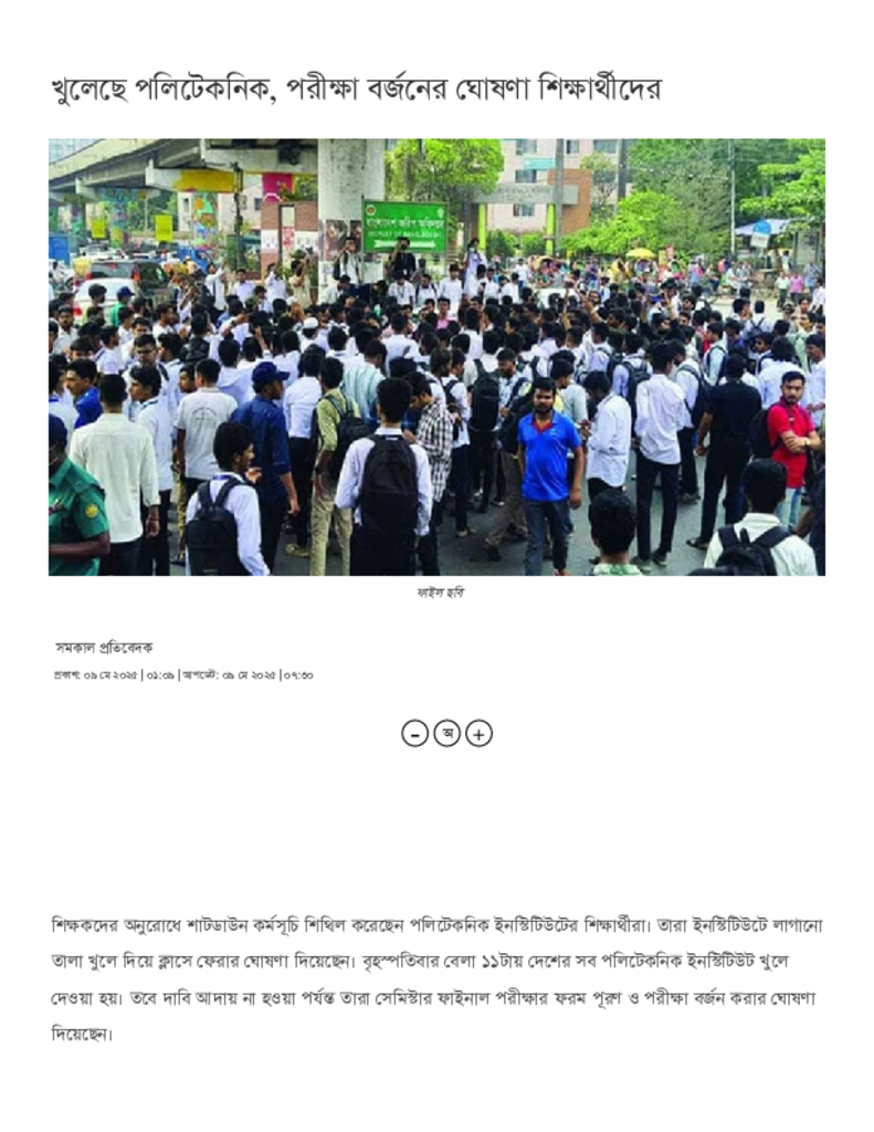 খুলেছে পলিটেকনিক, পরীক্ষা বর্জনের ঘোষণা শিক্ষার্থীদের.pdf Published on 09 May 2025 Newspaper দৈনিক সমকাল Category Technical and Vocational Education Download
