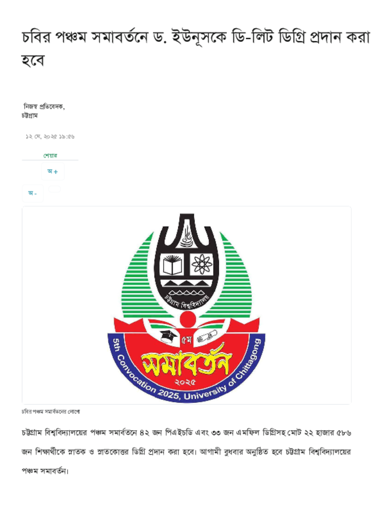 চবির পঞ্চম সমাবর্তনে ড. ইউনূসকে ডি-লিট ডিগ্রি প্রদান করা হবে.pdf Published on 12 May 2025 Newspaper দৈনিক কালের কন্ঠ Category General Education General Education Download