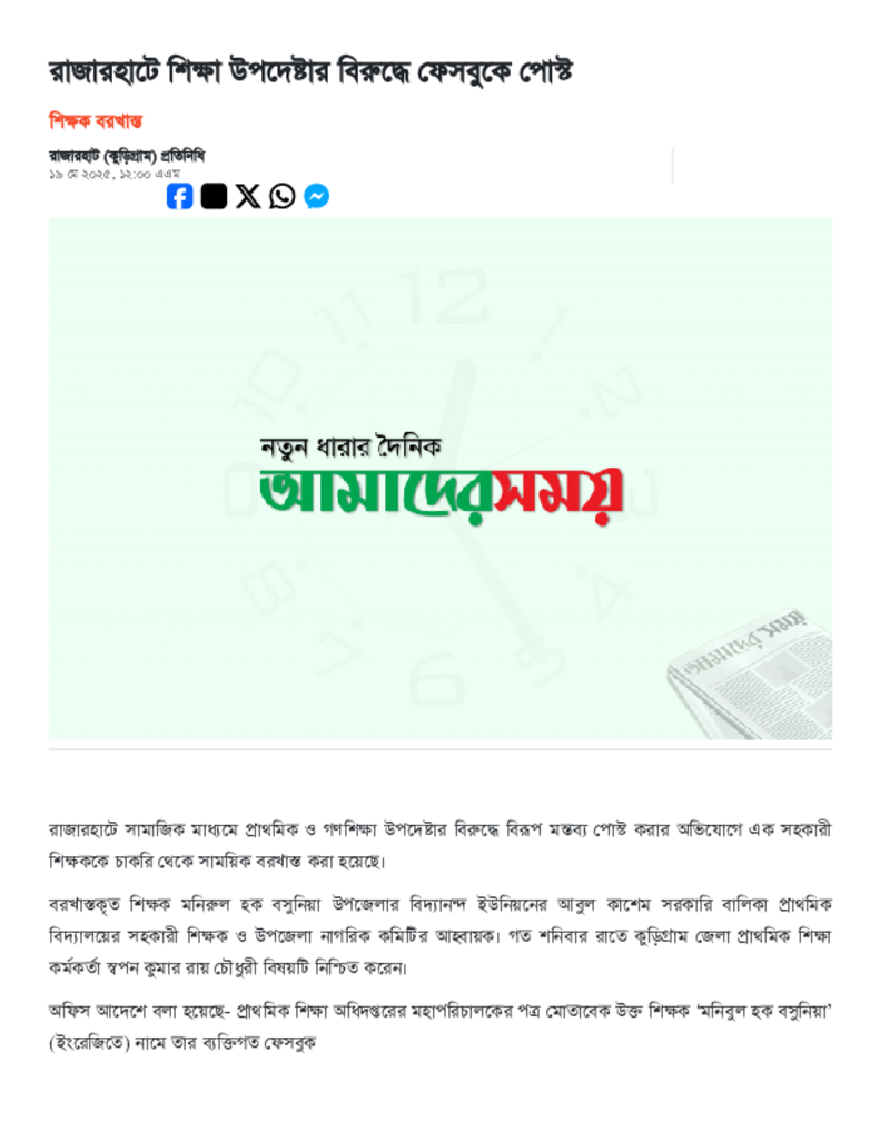 রাজারহাটে শিক্ষা উপদেষ্টার বিরুদ্ধে ফেসবুকে পোস্ট.pdf Published on 19 May 2025 Newspaper দৈনিক আমাদের সময় Category Others General Education Download