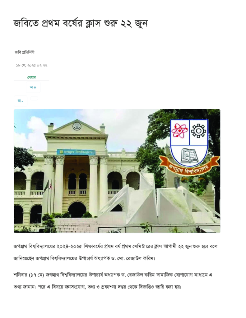 জবিতে প্রথম বর্ষের ক্লাস শুরু ২২ জুন.pdf Published on 18 May 2025 Newspaper দৈনিক কালের কন্ঠ Category Admission / Seat Problem General Education Download