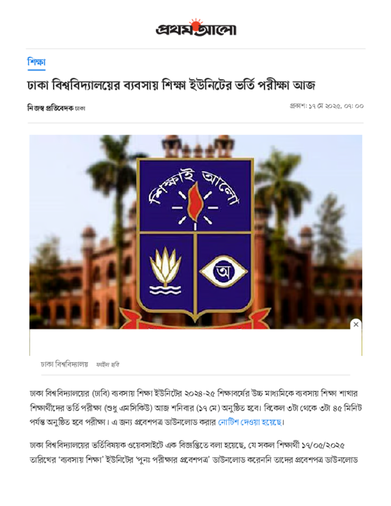 ঢাকা বিশ্ববিদ্যালয়ের ব্যবসায় শিক্ষা ইউনিটের ভর্তি পরীক্ষা আজ.pdf Published on 17 May 2025 Newspaper দৈনিক প্রথম আলো Category Admission / Seat Problem General Education Download