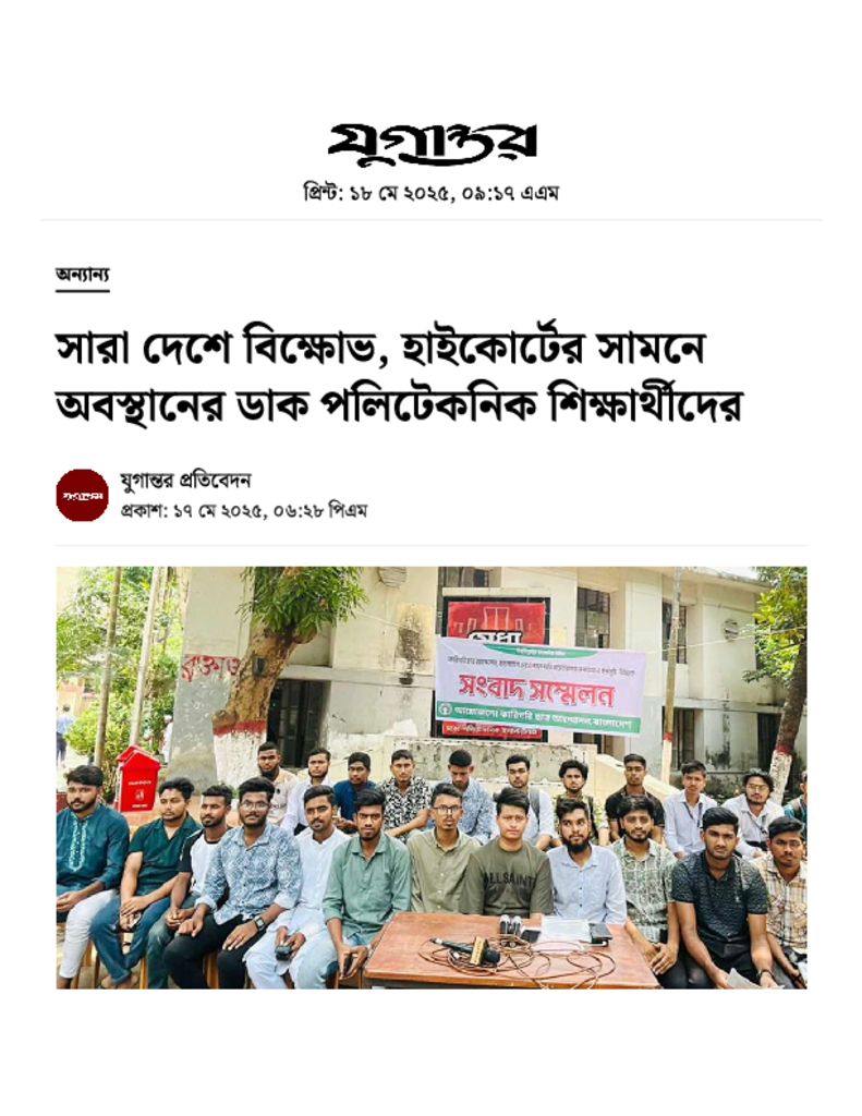 সারা দেশে বিক্ষোভ, হাইকোর্টের সামনে অবস্থানের ডাক পলিটেকনিক শিক্ষার্থীদের.pdf Published on 17 May 2025 Newspaper দৈনিক যুগান্তর Category Technical and Vocational Education Download