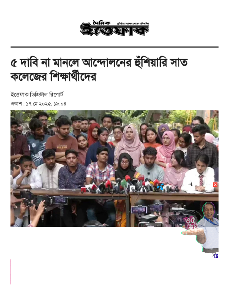 ৫ দাবি না মানলে আন্দোলনের হুঁশিয়ারি সাত কলেজের শিক্ষার্থীদের.pdf Published on 17 May 2025 Newspaper দৈনিক ইত্তেফাক Category Others General Education Download