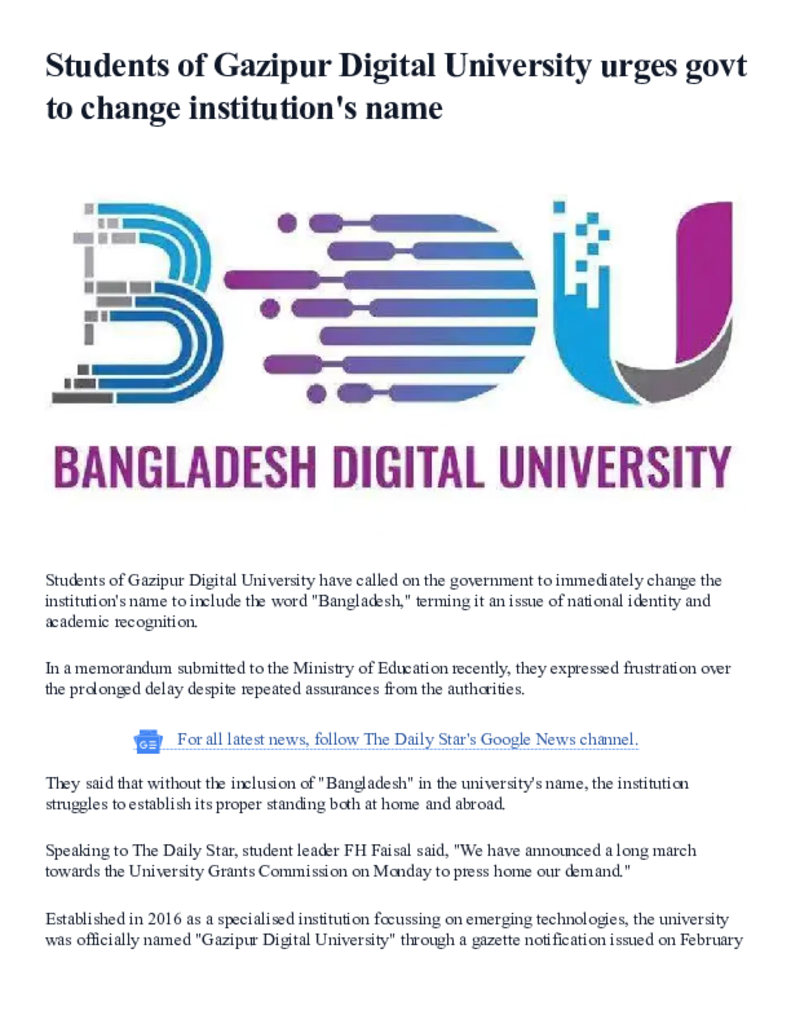 Students of Gazipur Digital University urges govt to change institution's name _ The Daily Star.pdf Published on 17 May 2025 Newspaper The Daily Star Category Personal Opinion / Discussion / Commentary General Education Download