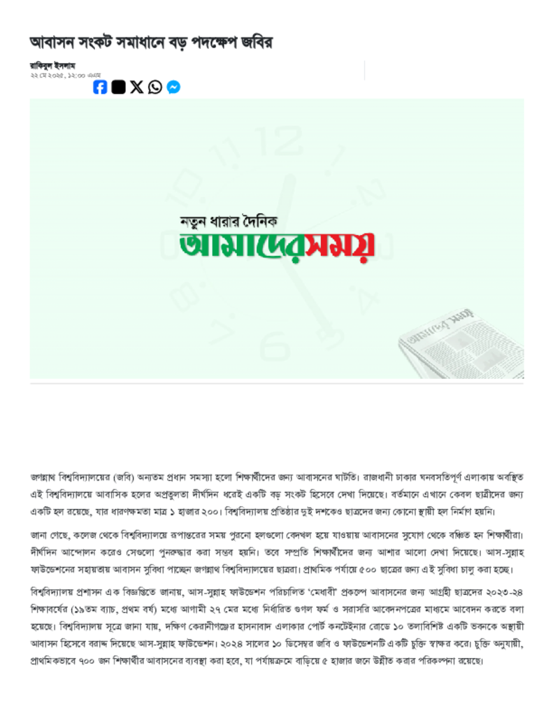 আবাসন সংকট সমাধানে বড় পদক্ষেপ জবির.pdf Published on 22 May 2025 Newspaper দৈনিক আমাদের সময় Category Admission / Seat Problem General Education Download