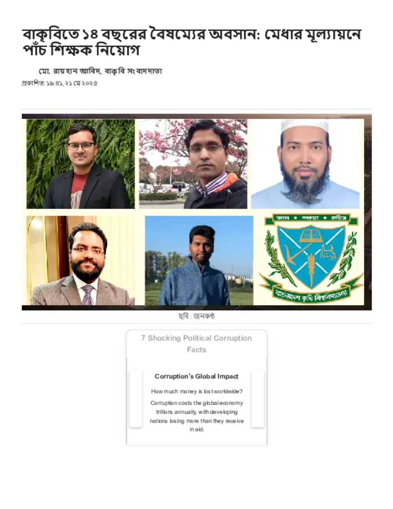 বাকৃবিতে ১৪ বছরের বৈষম্যের অবসান_ মেধার মূল্যায়নে পাঁচ শিক্ষক নিয়োগ.pdf Published on 21 May 2025 Newspaper দৈনিক জনকণ্ঠ Category Personal Opinion / Discussion / Commentary General Education Download