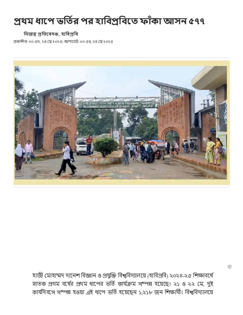 প্রথম ধাপে ভর্তির পর হাবিপ্রবিতে ফাঁকা আসন ৫৭৭.pdf Published on 24 May 2025 Newspaper দৈনিক সংবাদ Category Admission / Seat Problem General Education Download