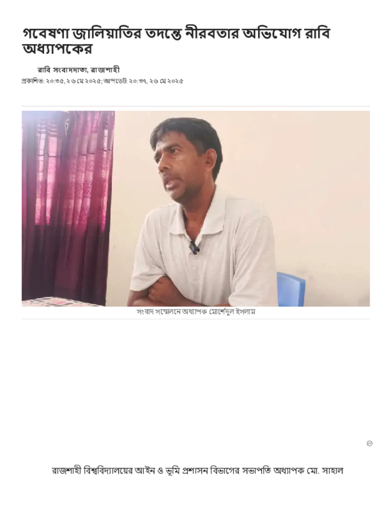 গবেষণা জালিয়াতির তদন্তে নীরবতার অভিযোগ রাবি অধ্যাপকের.pdf Published on 26 May 2025 Newspaper দৈনিক জনকণ্ঠ Category Personal Opinion / Discussion / Commentary General Education Download
