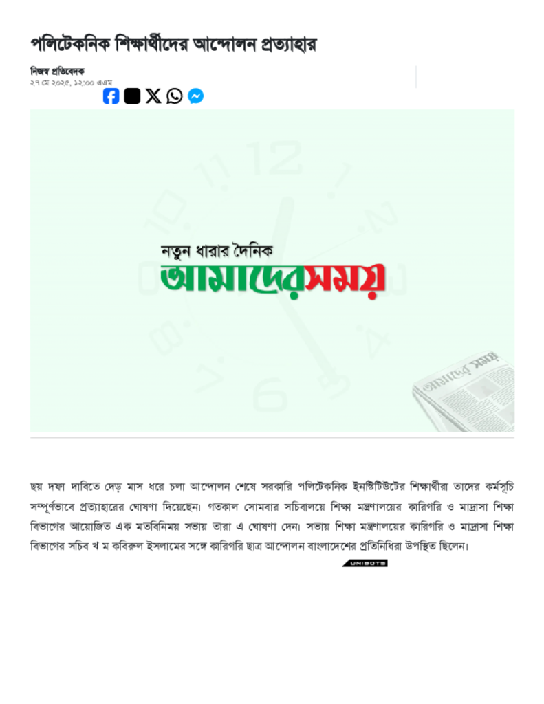 পলিটেকনিক শিক্ষার্থীদের আন্দোলন প্রত্যাহার.pdf Published on 27 May 2025 Newspaper দৈনিক আমাদের সময় Category Technical and Vocational Education Download