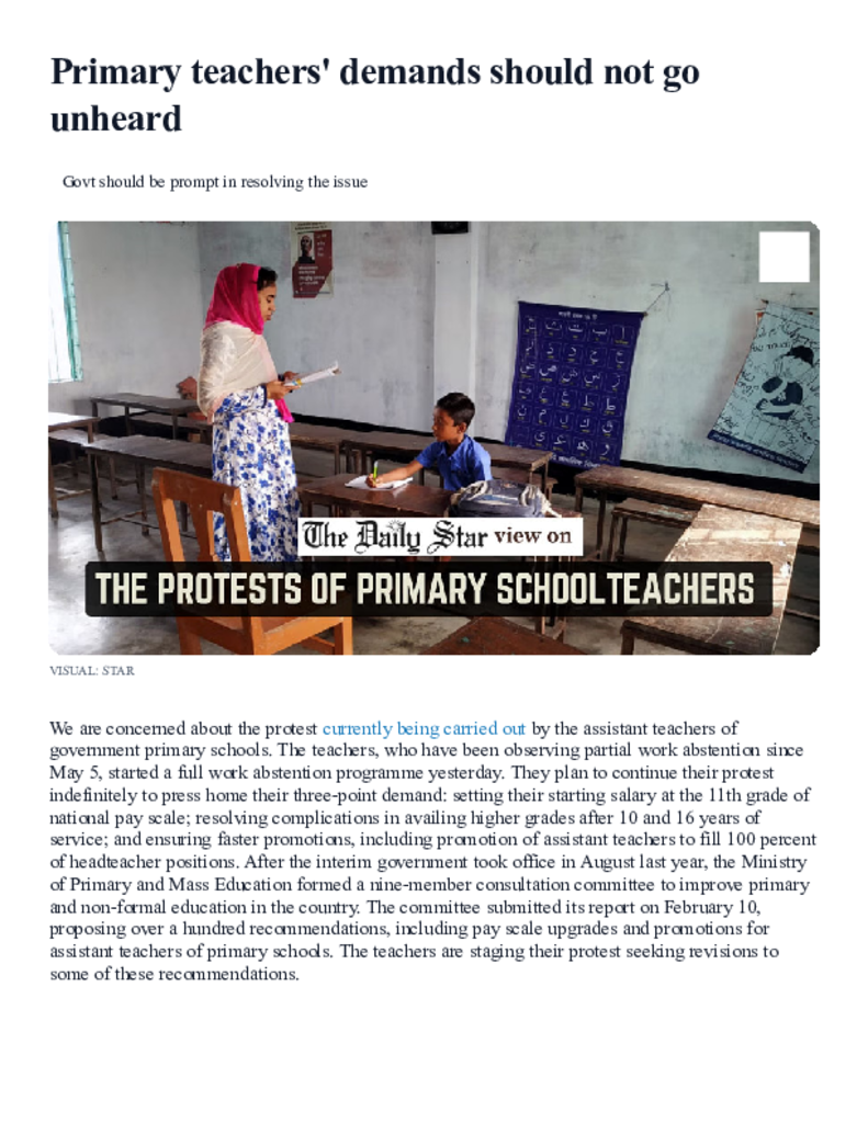 Primary teachers' demands should not go unheard _ The Daily Star.pdf Published on 27 May 2025 Newspaper The Daily Star Category Personal Opinion / Discussion / Commentary General Education Download