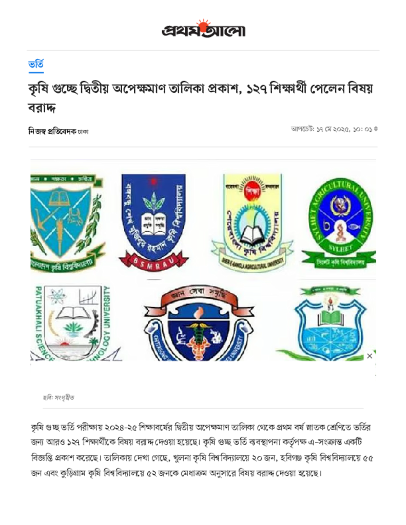 কৃষি গুচ্ছে দ্বিতীয় অপেক্ষমাণ তালিকা প্রকাশ, ১২৭ শিক্ষার্থী পেলেন বিষয় বরাদ্দ.pdf Published on 17 May 2025 Newspaper দৈনিক প্রথম আলো Category Admission / Seat Problem General Education Download