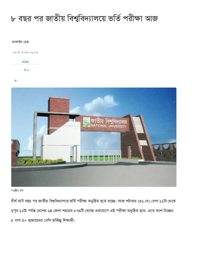 ৮ বছর পর জাতীয় বিশ্ববিদ্যালয়ে ভর্তি পরীক্ষা আজ.pdf Published on 31 May 2025 Newspaper দৈনিক কালের কন্ঠ Category Admission / Seat Problem General Education Download