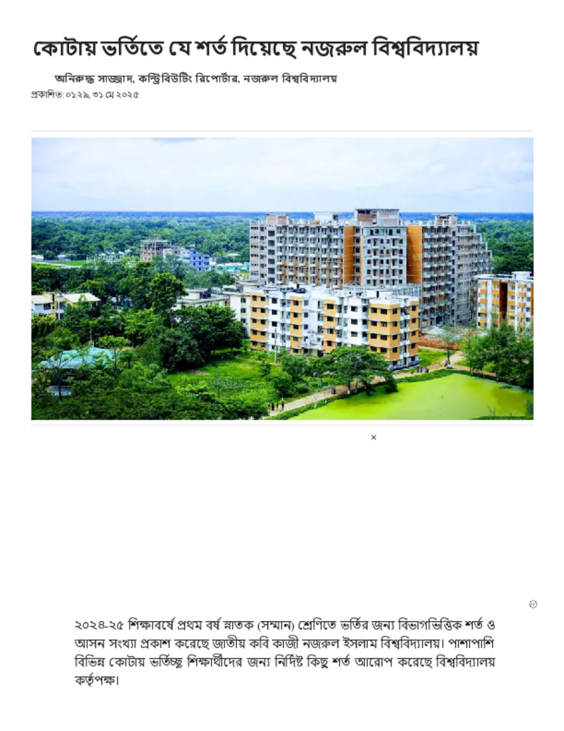 কোটায় ভর্তিতে যে শর্ত দিয়েছে নজরুল বিশ্ববিদ্যালয়.pdf Published on 31 May 2025 Newspaper দৈনিক জনকণ্ঠ Category Admission / Seat Problem General Education Download