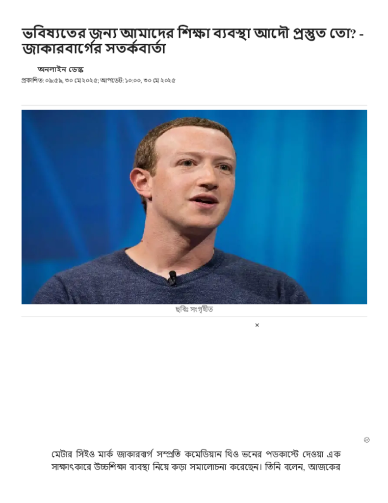 ভবিষ্যতের জন্য আমাদের শিক্ষা ব্যবস্থা আদৌ প্রস্তুত তো_ - জাকারবার্গের সতর্কবার্তা.pdf Published on 30 May 2025 Newspaper দৈনিক জনকণ্ঠ Category Personal Opinion / Discussion / Commentary Download