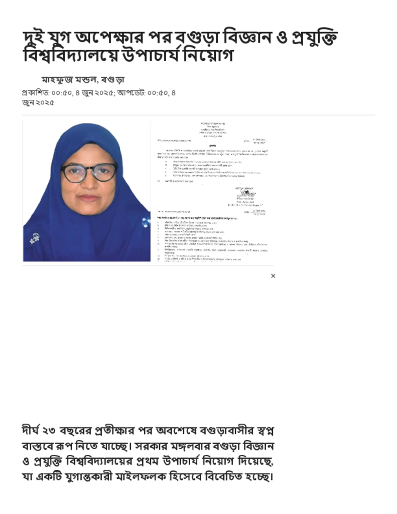 দুই যুগ অপেক্ষার পর বগুড়া বিজ্ঞান ও প্রযুক্তি বিশ্ববিদ্যালয়ে উপাচার্য নিয়োগ.pdf Published on 04 June 2025 Newspaper দৈনিক জনকণ্ঠ Category Educational Ministry / Departments General Education Download