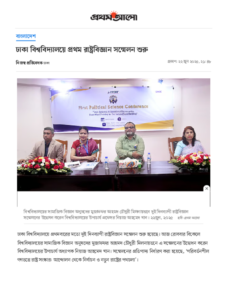 ঢাকা বিশ্ববিদ্যালয়ে প্রথম রাষ্ট্রবিজ্ঞান সম্মেলন শুরু.pdf Published on 22 June 2025 Newspaper দৈনিক প্রথম আলো Category General Education General Education Download