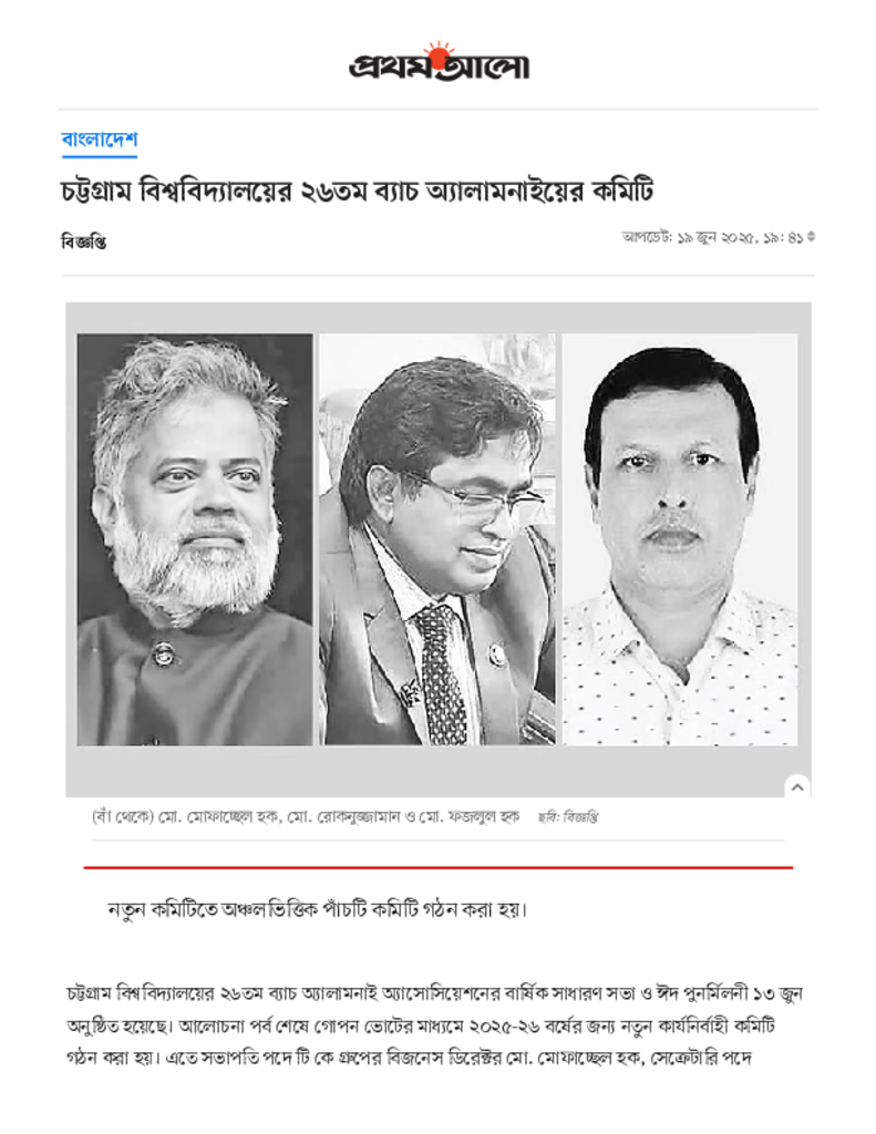 চট্টগ্রাম বিশ্ববিদ্যালয়ের ২৬তম ব্যাচ অ্যালামনাইয়ের কমিটি _ প্রথম আলো.pdf Published on 19 June 2025 Newspaper দৈনিক প্রথম আলো Category General Education General Education Download