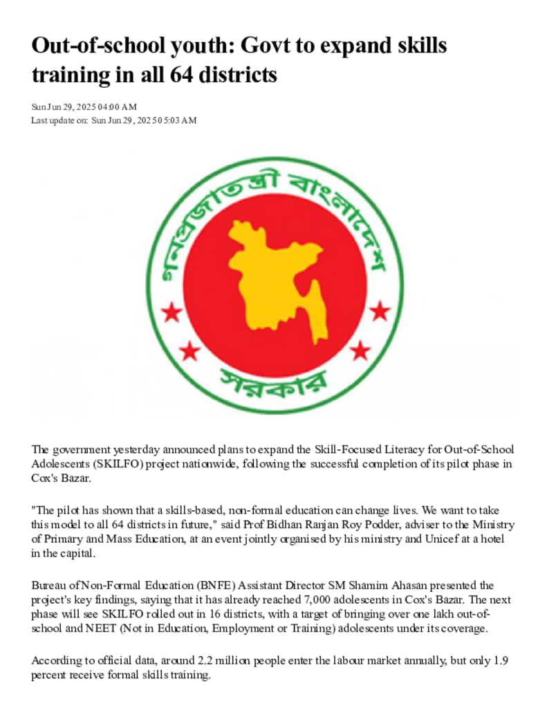 Out-of-school youth_ Govt to expand skills training in all 64 districts.pdf Published on 29 June 2025 Newspaper The Daily Star Category Personal Opinion / Discussion / Commentary Download