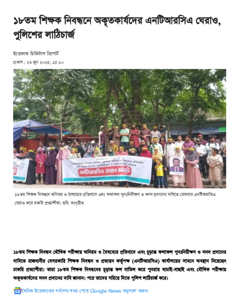 ১৮তম শিক্ষক নিবন্ধনে অকৃতকার্যদের এনটিআরসিএ ঘেরাও, পুলিশের লাঠিচার্জ.pdf Published on 29 June 2025 Newspaper দৈনিক ইত্তেফাক Category Others Download