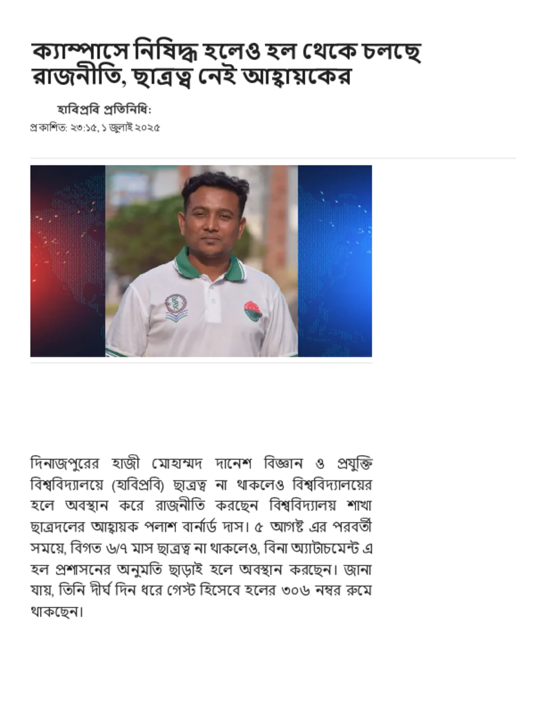 ক্যাম্পাসে নিষিদ্ধ হলেও হল থেকে চলছে রাজনীতি, ছাত্রত্ব নেই আহ্বায়কের.pdf Published on 01 July 2025 Newspaper দৈনিক জনকণ্ঠ Category Student Politics General Education Download