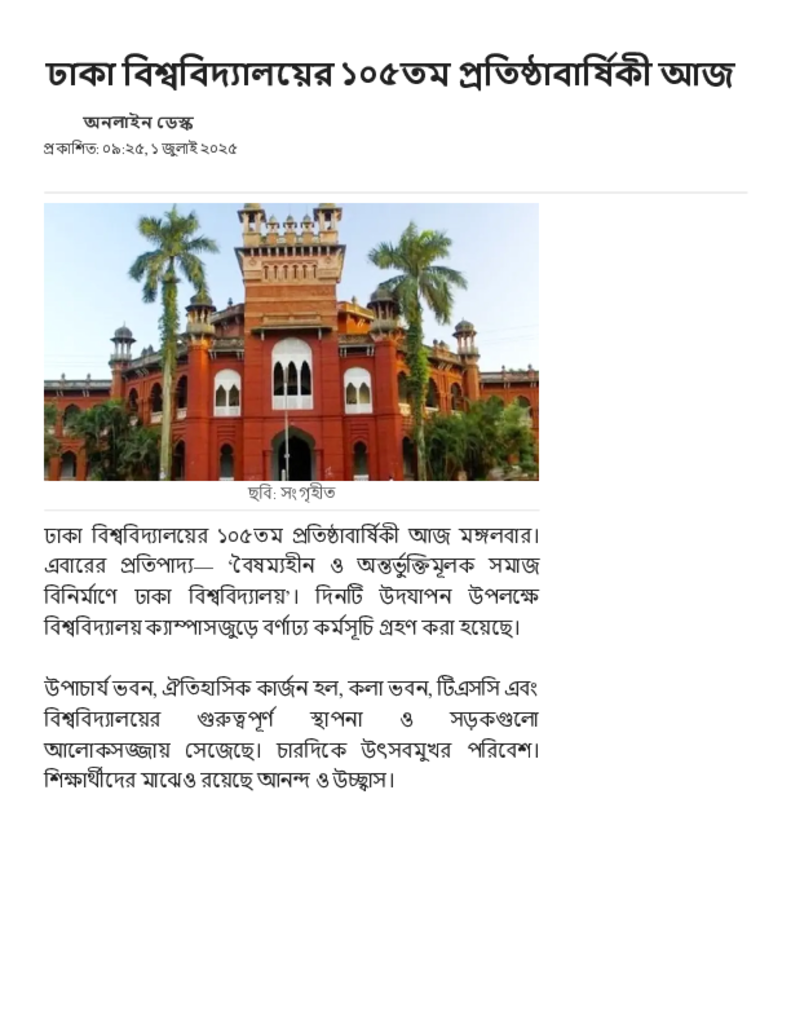 ঢাকা বিশ্ববিদ্যালয়ের ১০৫তম প্রতিষ্ঠাবার্ষিকী আজ.pdf Published on 01 July 2025 Newspaper দৈনিক জনকণ্ঠ Category Personal Opinion / Discussion / Commentary General Education Download