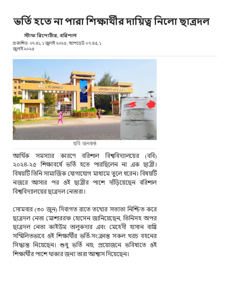ভর্তি হতে না পারা শিক্ষার্থীর দায়িত্ব নিলো ছাত্রদল.pdf Published on 01 July 2025 Newspaper দৈনিক জনকণ্ঠ Category Student Politics General Education Download