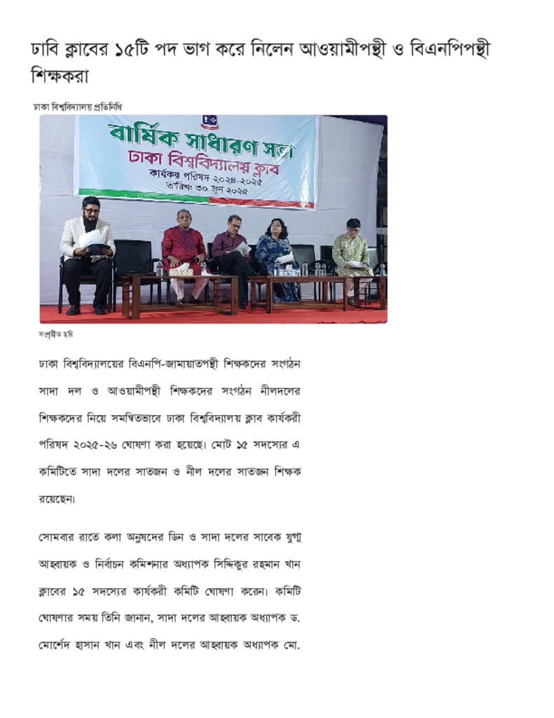 ঢাবি ক্লাবের ১৫টি পদ ভাগ করে নিলেন আওয়ামীপন্থী ও বিএনপিপন্থী শিক্ষকরা.pdf Published on 01 July 2025 Newspaper দৈনিক যুগান্তর Category Others General Education Download