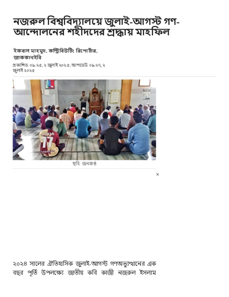নজরুল বিশ্ববিদ্যালয়ে জুলাই-আগস্ট গণ-আন্দোলনের শহীদদের শ্রদ্ধায় মাহফিল.pdf Published on 02 July 2025 Newspaper দৈনিক জনকণ্ঠ Category Others General Education Download