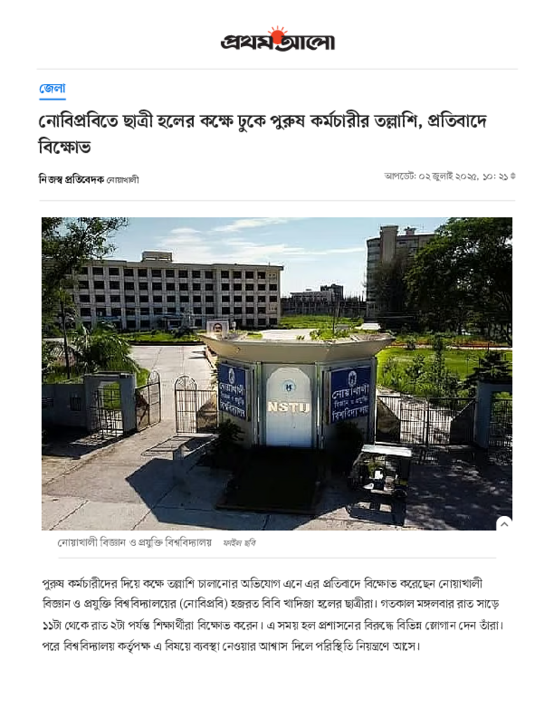 নোয়াখালী বিজ্ঞান ও প্রযুক্তি বিশ্ববিদ্যালয়ের হলে গভীর রাতে ছাত্রীদের বিক্ষোভ.pdf Published on 02 July 2025 Newspaper দৈনিক প্রথম আলো Category Others General Education Download