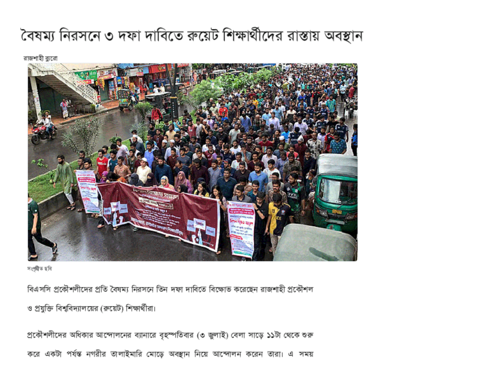 বৈষম্য নিরসনে ৩ দফা দাবিতে রুয়েট শিক্ষার্থীদের রাস্তায় অবস্থান.pdf Published on 03 July 2025 Newspaper দৈনিক কালের কন্ঠ Category Personal Opinion / Discussion / Commentary Professional Education Engineering Download