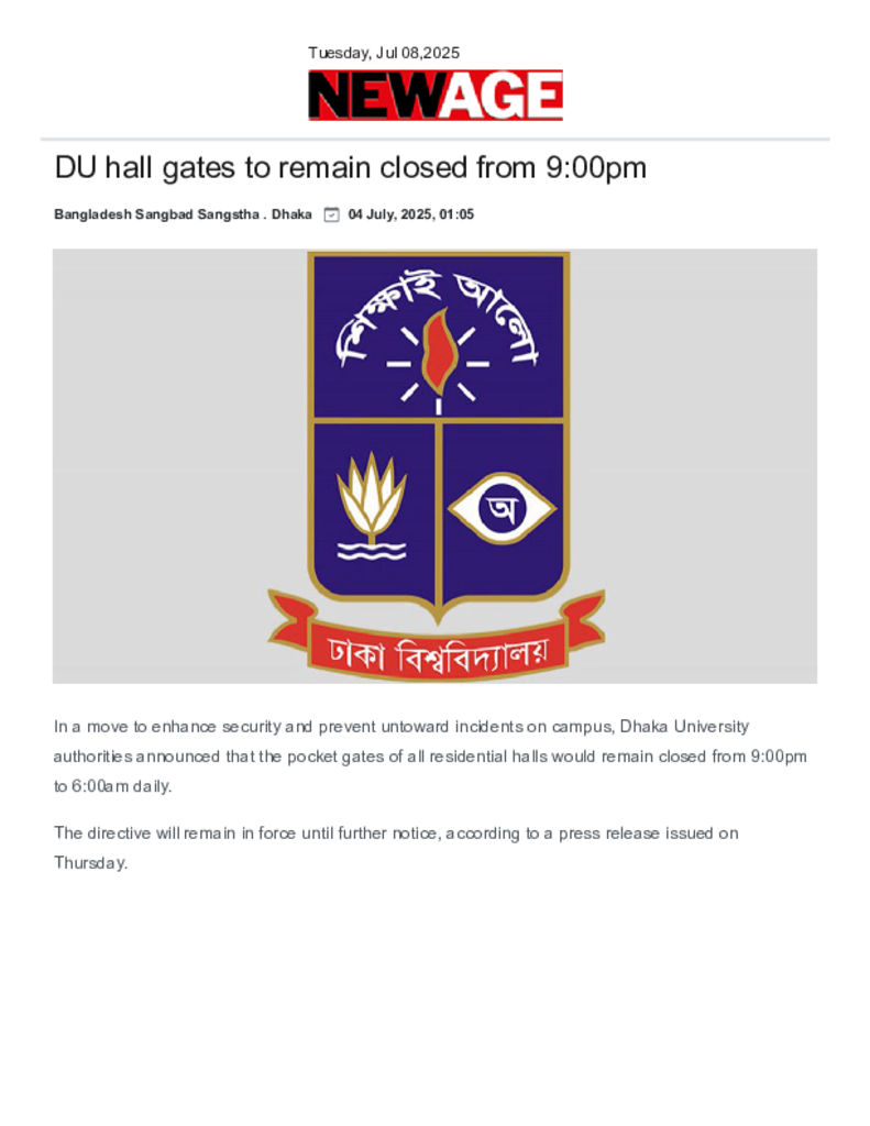 New Age _ DU hall gates to remain closed from 9_00pm.pdf Published on 04 July 2025 Newspaper New Age Category General Education General Education Download