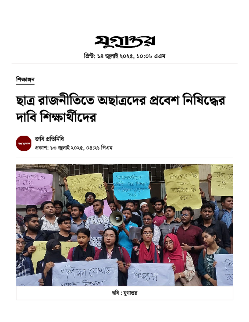 ছাত্র রাজনীতিতে অছাত্রদের প্রবেশ নিষিদ্ধের দাবি শিক্ষার্থীদের.pdf Published on 13 July 2025 Newspaper দৈনিক যুগান্তর Category General Education General Education Download